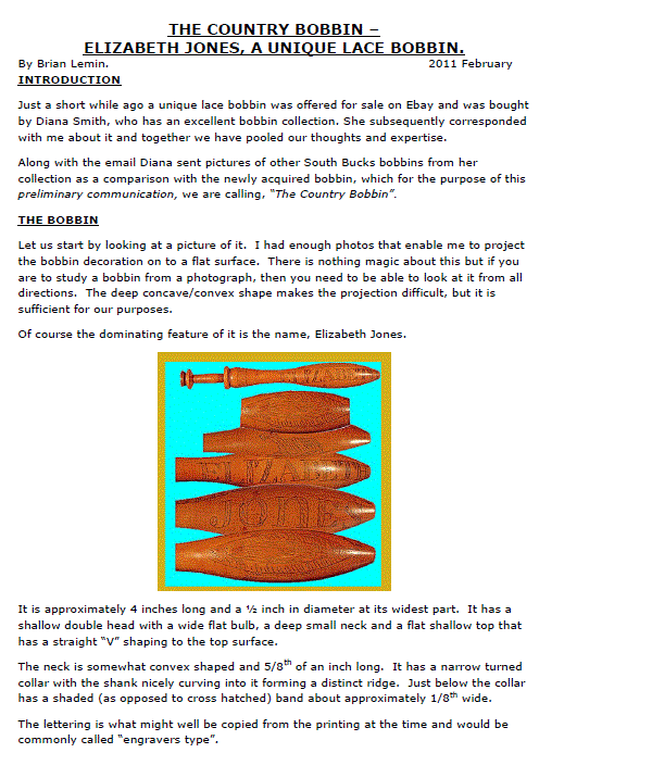 Lemin, Brian. The Country Bobbin - Elizabeth Jones, a Unique Lace Bobbin 4 pages. Posted June 27, 2011. FIRST PAGE. File size 224KB PDF