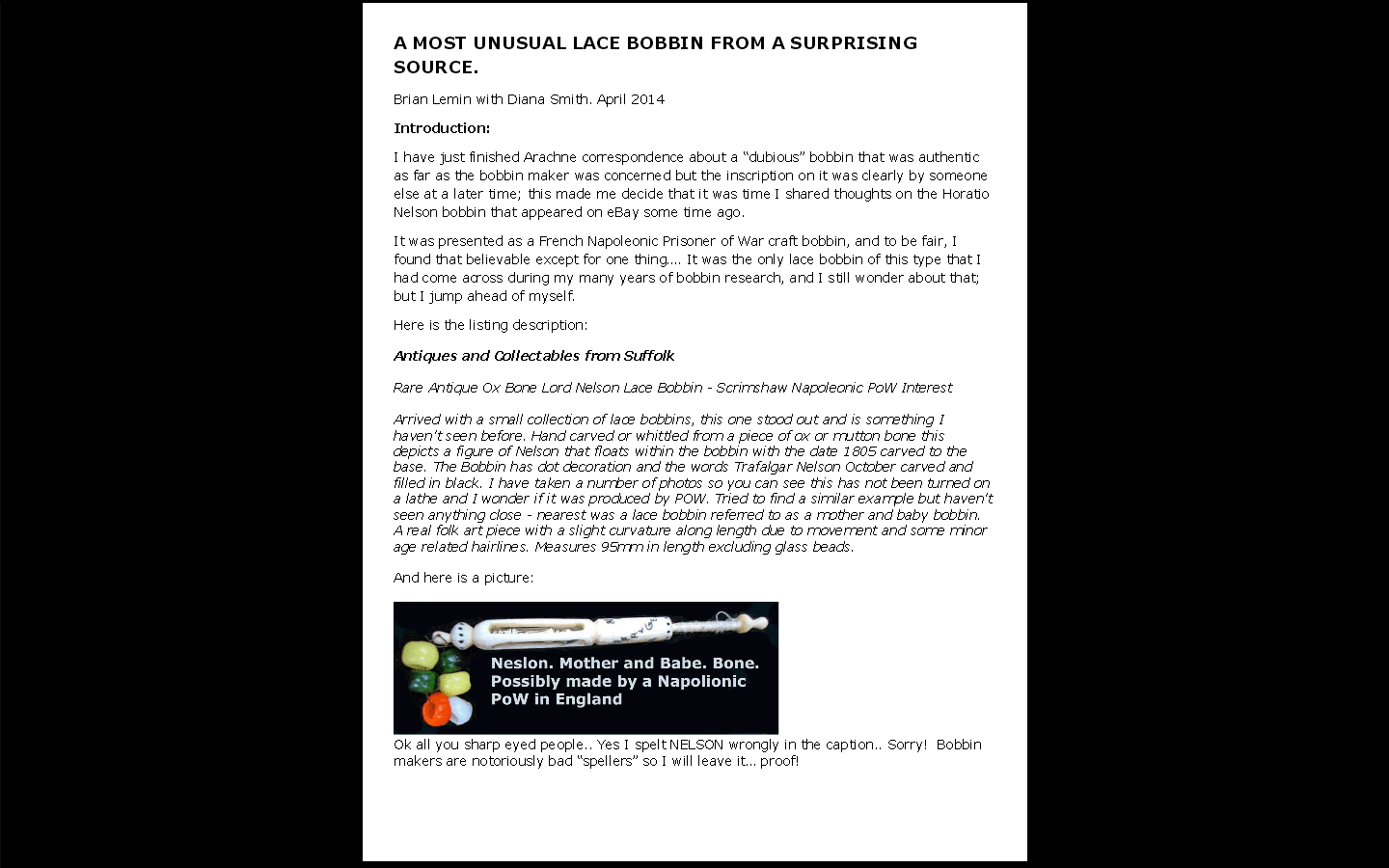 Lemin, Brian. and Smith, D.A Most Unusual Lace Bobbin from a Surprising Source, 18 pages. Posted May 3, 2014. FIRST PAGE. File size 1,000KB PDF
