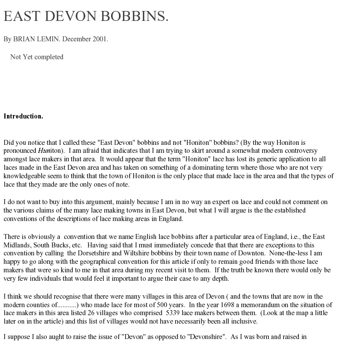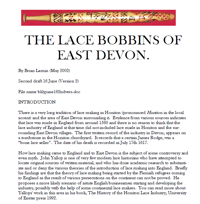 Lemin, Brian. The Lace Bobbins of East Devon, 22 pages. Posted April 27, 2014. FIRST PAGE. File size 63KB PDF