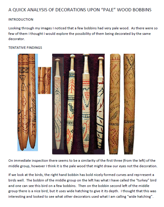 Lemin, Brian. A Quick Analysis of Decorations upon 'Pale' Wood Bobbins, 2 pages. Posted April 27, 2014. FIRST PAGE. File size 124KB PDF