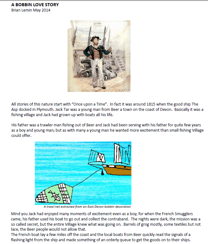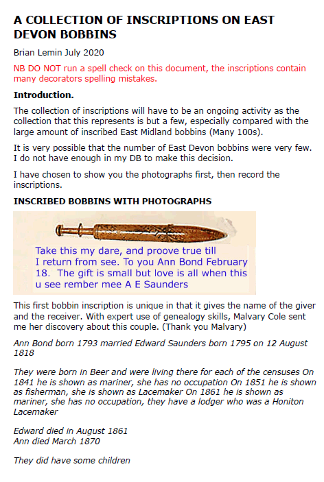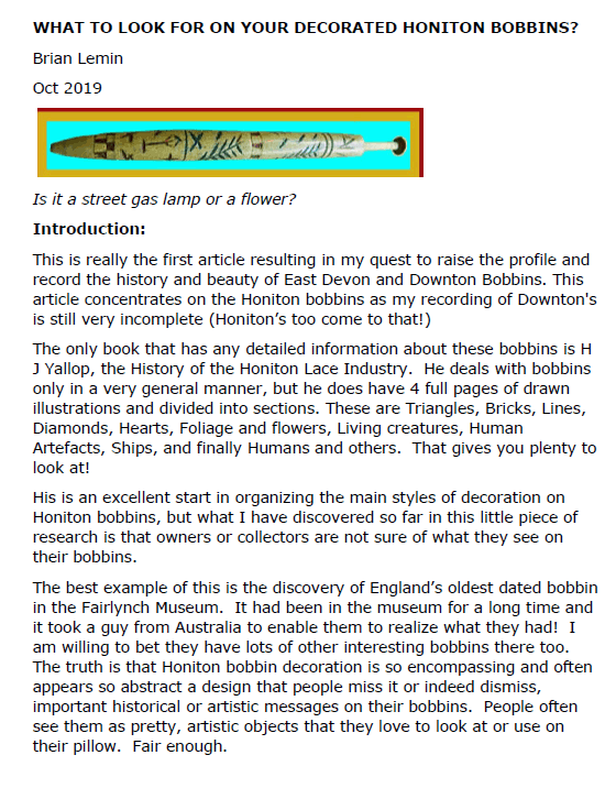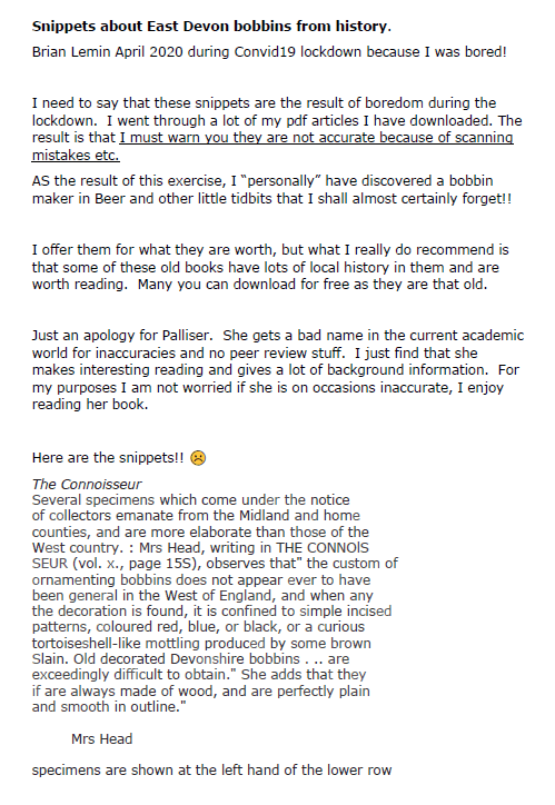 Lemin, Brian. Snippets about East Devon Bobbins from History, 9 pages. Posted April 2020. FIRST PAGE. File size 160KB PDF