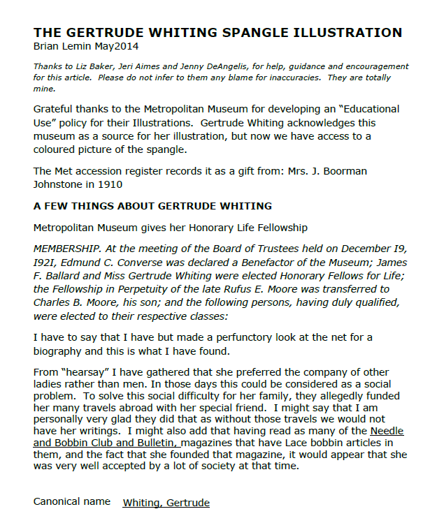 Lemin, Brian. The Gertrude Whiting Spangle Illustration, 10 pages. Posted May 21, 2014. FIRST PAGE. File size 1.2 MB PDF