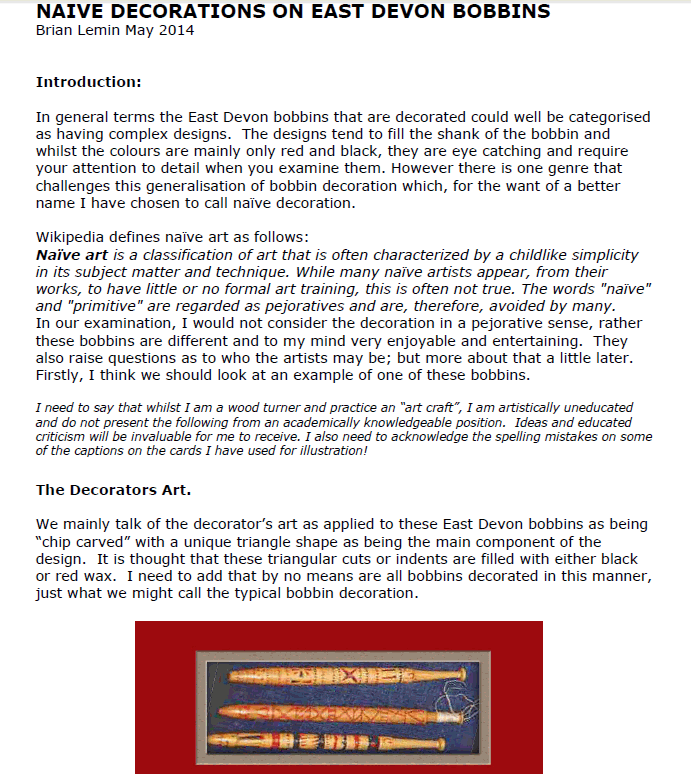 Lemin, Brian. Naive Decorations on East Devon Bobbins, 8 pages. Posted May 24, 2014. FIRST PAGE. File size 1.2 MB PDF