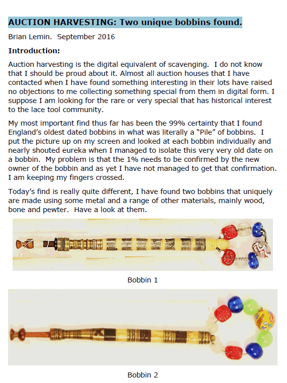 Lemin, Brian. AUCTION HARVESTING: Two unique bobbins found., 4 pages. Posted October 19, 2016. FIRST PAGE. File size 385KB PDF