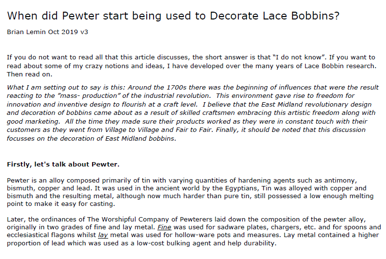 Lemin, Brian. When did Pewter start being used to Decorate Lace Bobbins?, 13 pages. Posted October 27, 2019. FIRST PAGE. File size 1016 KB PDF