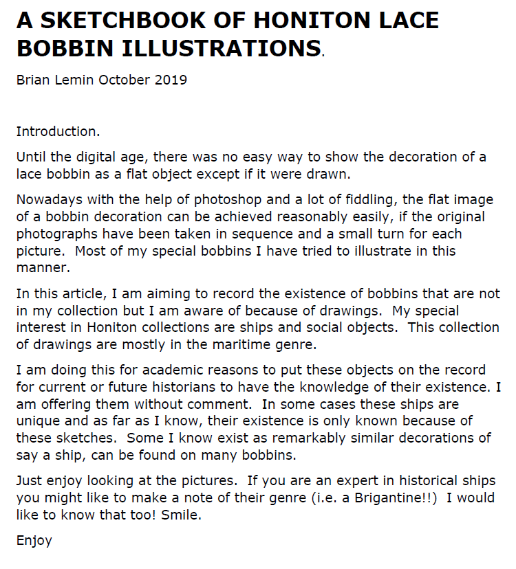Lemin, Brian. A Sketchbook of Honiton Lace Bobbin Illustrations, 16 pages. Posted October 30, 2019. FIRST PAGE. File size 1,400 KB PDF