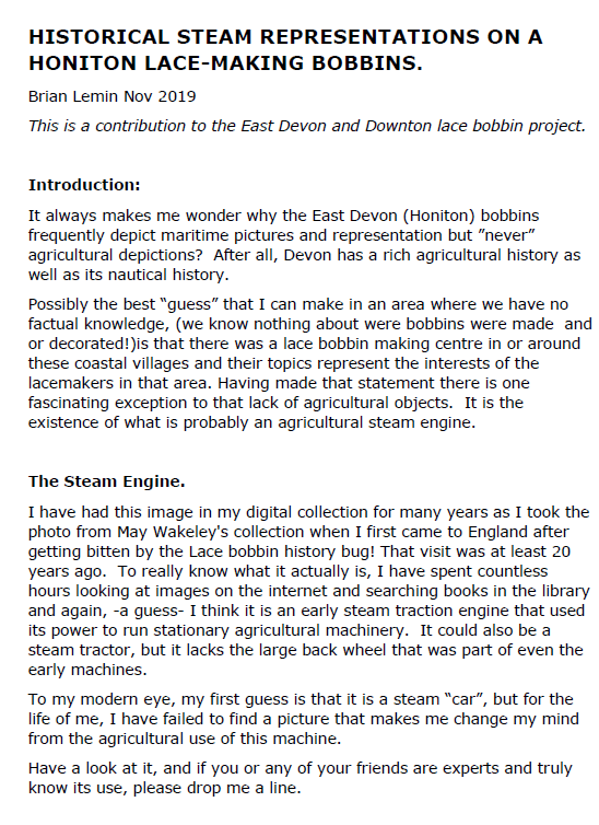 Lemin, Brian. Historical Steam Representations on a Honiton Lace-making Bobbins, 6 pages. Posted November 5, 2019. FIRST PAGE. File size 592 KB PDF
