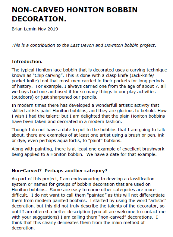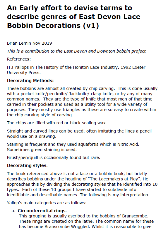 Lemin, Brian. An Early effort to devise terms to describe genres of East Devon Lace Bobbin Decorations (v1) , 9 pages. Posted November 10, 2019. FIRST PAGE. File size 941KB PDF