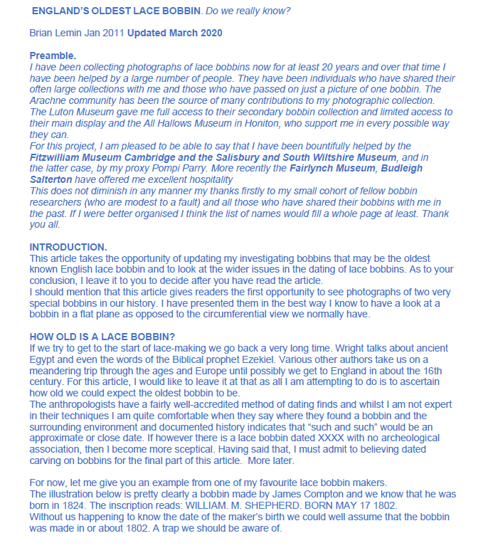 Lemin, Brian. England's Oldest Lace Bobbin. Do We Really Know ?, 11 pages. Posted March 2020. FIRST PAGE. File size 1,046KB PDF