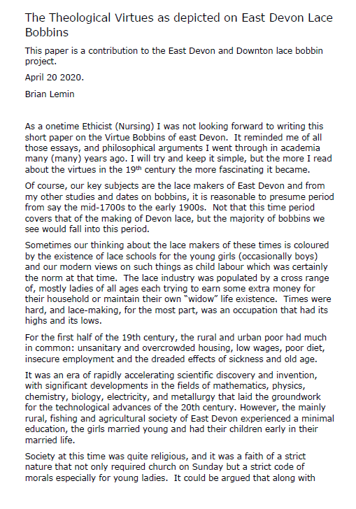 Lemin, Brian. The Theological Virtues as depicted on East Devon Lace Bobbins, 8 pages. Posted April, 2020. FIRST PAGE. File size 536KB PDF