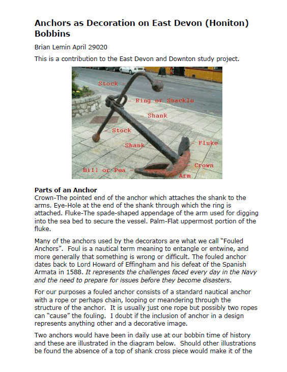 Lemin, Brian. Anchors as Decoration on East Devon (Honiton) Bobbins, 4 pages. Posted April, 2020. FIRST PAGE. File size 211KB PDF