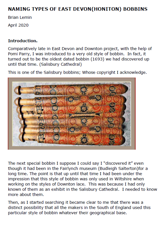 Lemin, Brian. Naming Types of East Devon (Honiton) Bobbins, 9 pages. Posted April 2020. FIRST PAGE. File size 1,046KB PDF