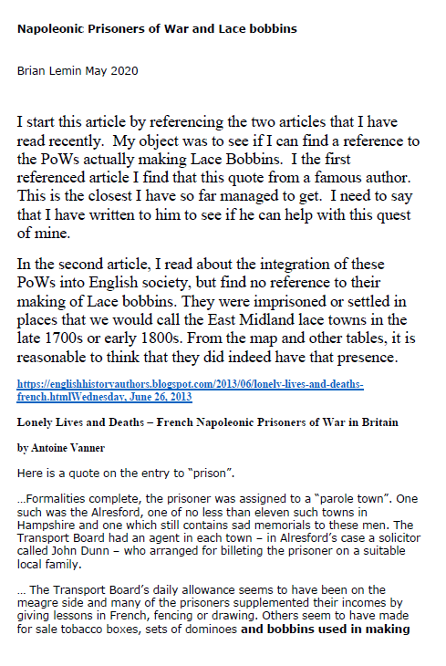 Lemin, Brian. Napoleonic Prisoners of War and Lace Bobbins, 12 pages. Posted June 2020. FIRST PAGE. File size 344KB PDF