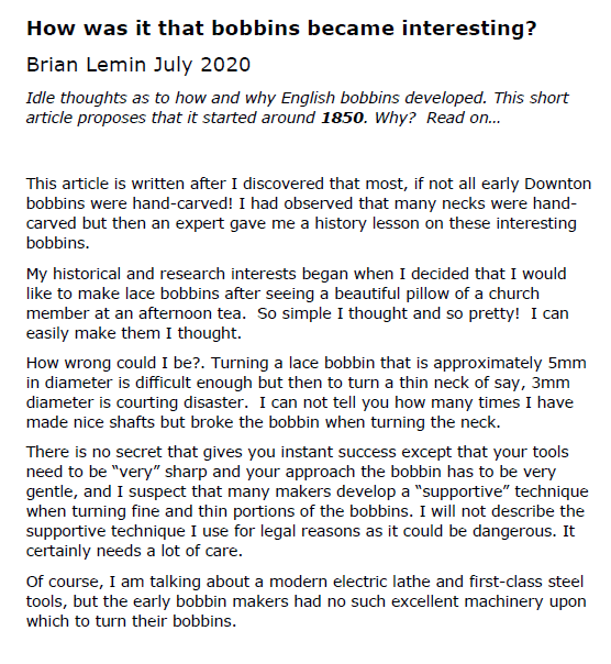 Lemin, Brian. How Was it that Bobbins Became Interesting? , 5 pages. Posted July, 2020. FIRST PAGE. File size 1,600KB PDF