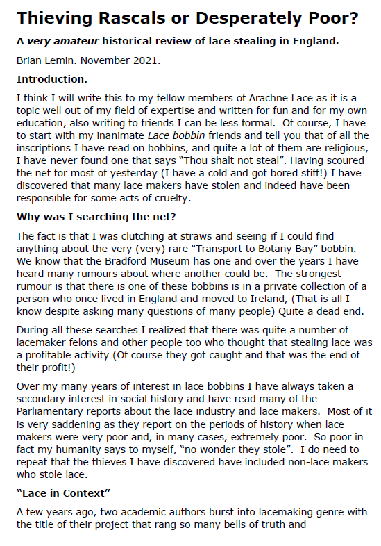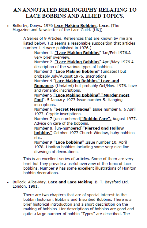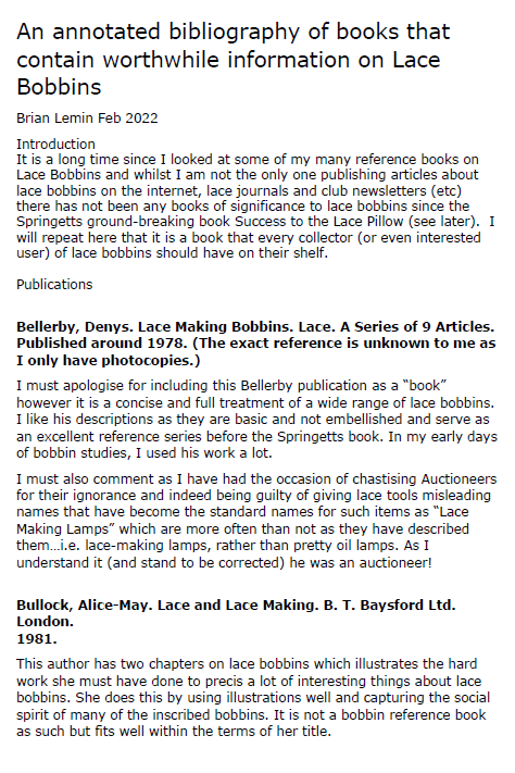 Lemin, Brian. An Annotated Bibliography of Books That Contain Worthwhile Information on Lace Bobbins, 4 pages. Posted 7 March, 2022 FIRST PAGE. File size 67 KB PDF