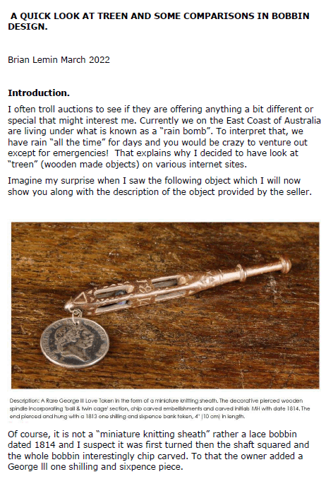 Lemin, Brian. A Quick Look at Treen and Some Comparisons in Bobbin Design., 8 pages. Posted 7 March, 2022 FIRST PAGE. File size 1061 KB PDF