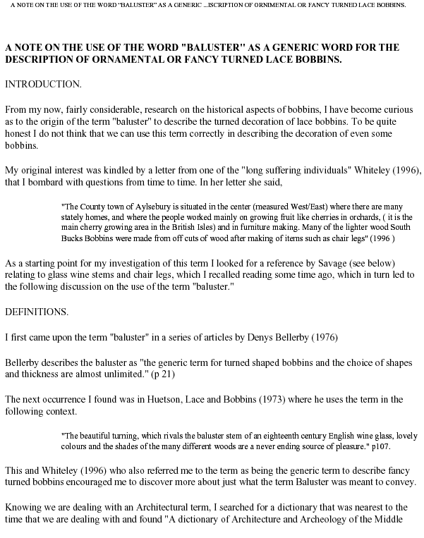 Lemin, Brian. A Note on the Use of the Word 'Baluster' as a Generic Word for the Description of Ornamental or Fancy Turned Bobbins, 6 pages. Posted June 19, 2003. FIRST PAGE. File size 24 KB PDF