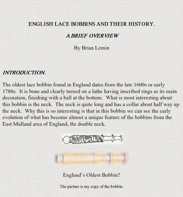 Lemin, Brian. English Lace Bobbins and Their History: A Brief Overview, 11 pages. Posted June 5, 2003. FIRST PAGE. File size 144 KB PDF
