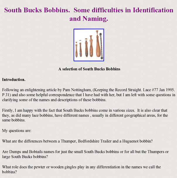 Lemin, Brian. South Bucks Bobbins; Some Difficulties in Identification and Naming, 10 pages. Posted June 10, 2003. FIRST PAGE. File size 36 KB PDF