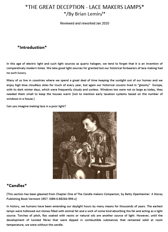 Lemin, Brian. Lacemakers Lamps, 12 pages. Note: (updated Jan 2011). Posted June 10, 2003. FIRST PAGE. File size 416 KB PDF