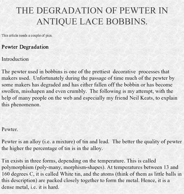 Lemin, Brian. The Degradation of Pewter in Antique Lace Bobbins, 4 pages. Posted June 10, 2003. FIRST PAGE. File size 24 KB PDF