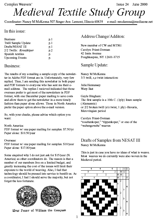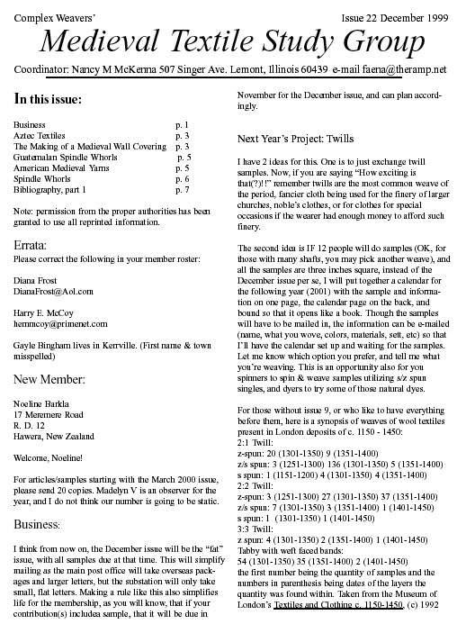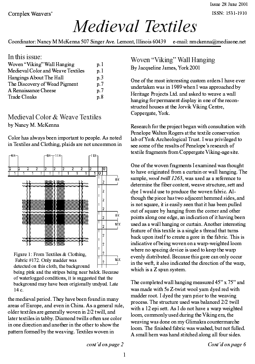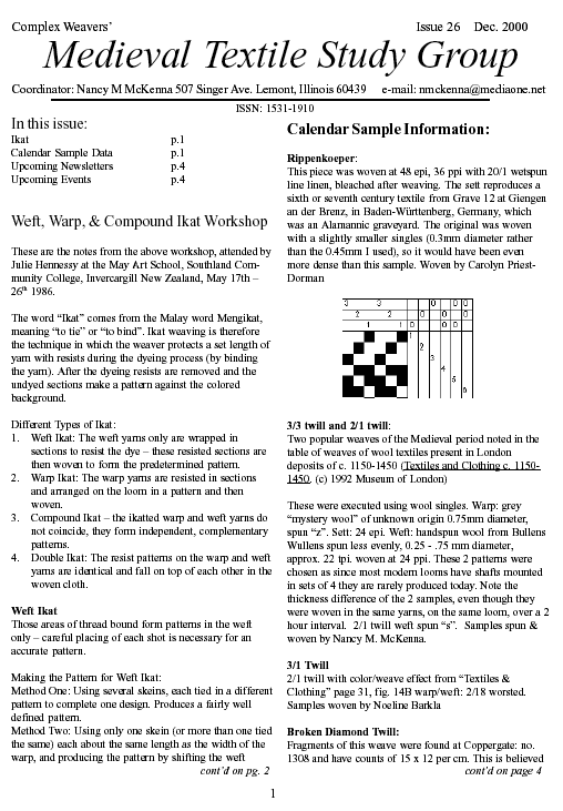 McKenna, Nancy M., ed. Complex Weavers Medieval Textiles Study Group Newsletter 26, 4 pages. Posted June 12, 2000. FIRST PAGE. File size 69 KB PDF