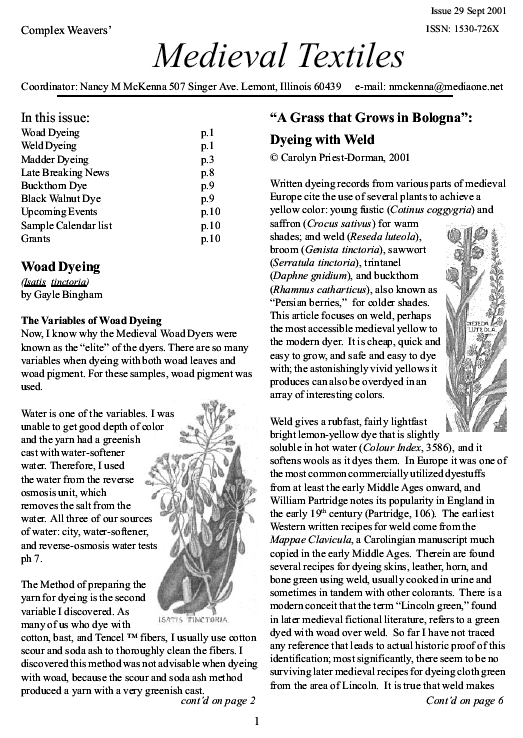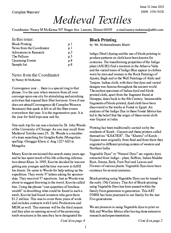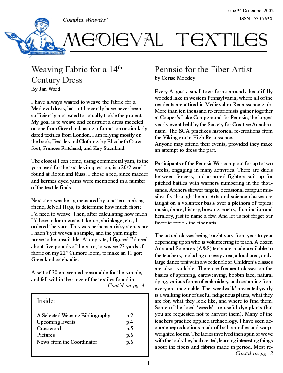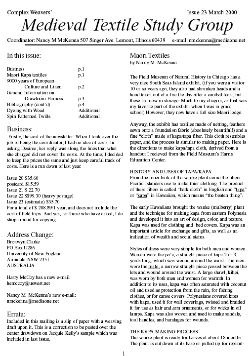 Nancy M. McKenna for permission to post the newsletters of the Complex Weavers Medieval Textiles Study Group.