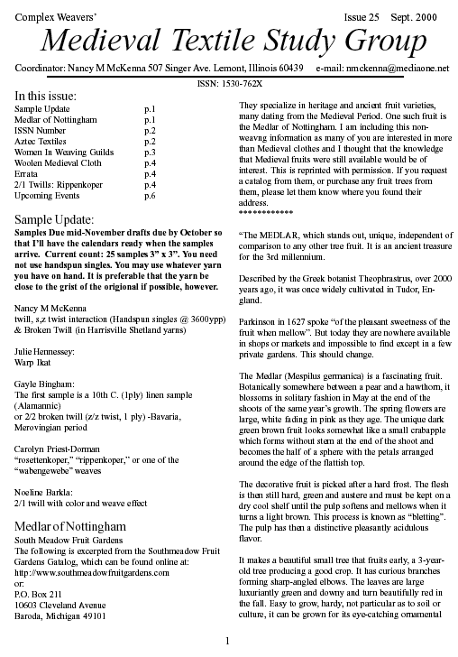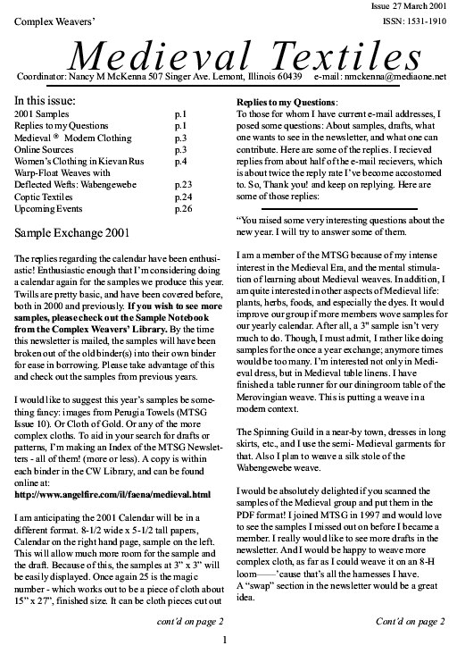 McKenna, Nancy M., ed. Complex Weavers Medieval Textiles Study Group Newsletter 27, 27 pages. Posted June 12, 2000. FIRST PAGE. File size 42 KB PDF