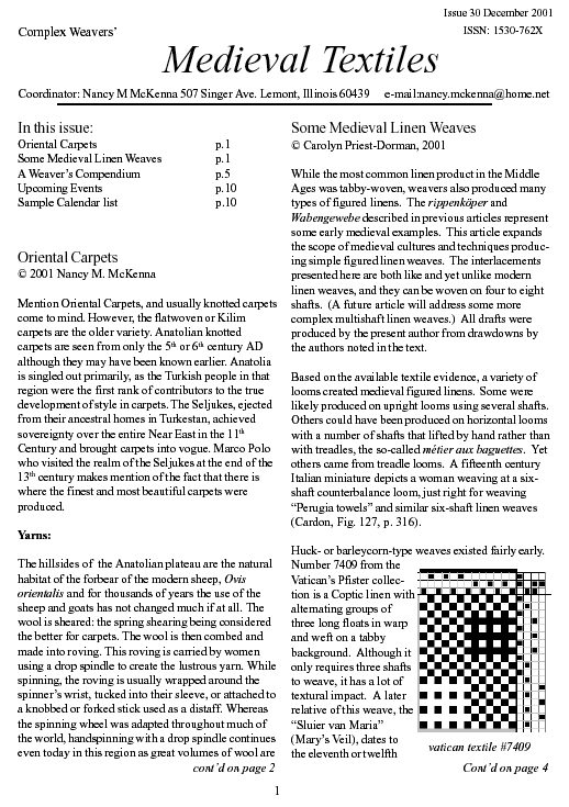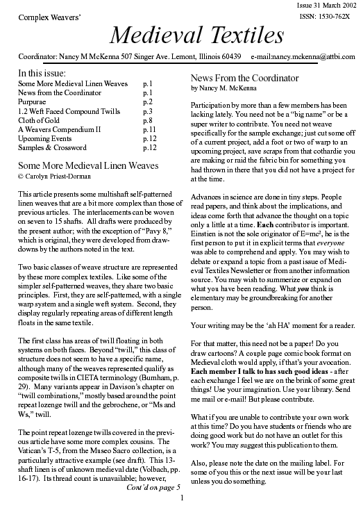 McKenna, Nancy M., ed. Complex Weavers Medieval Textiles Study Group Newsletter 31, 13 pages. Posted March 19, 2002. FIRST PAGE. File size 287 KB PDF