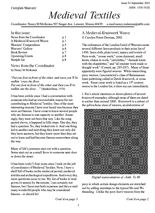 McKenna, Nancy M., ed. Complex Weavers Medieval Textiles Study Group Newsletter 34, 6 pages. Posted December 19, 2004. FIRST PAGE. File size 284 KB PDF