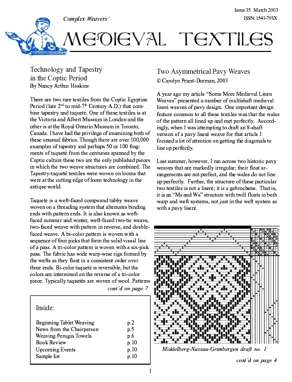 McKenna, Nancy M., ed. Complex Weavers Medieval Textiles Study Group Newsletter 29, 14 pages. Posted March 19, 2002. FIRST PAGE. File size 636 KB PDF
