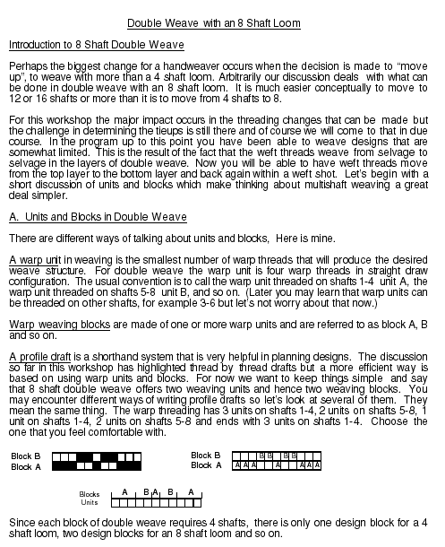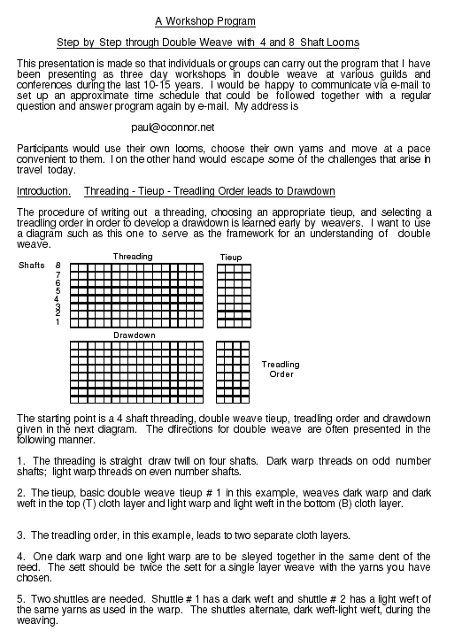 O'Connor, Paul R. Double Weave Workshop Notes: Double Weave with a Eight-Shaft Loom, 13 pages. Posted February 4, 2000. FIRST PAGE. File size 163 KB PDF