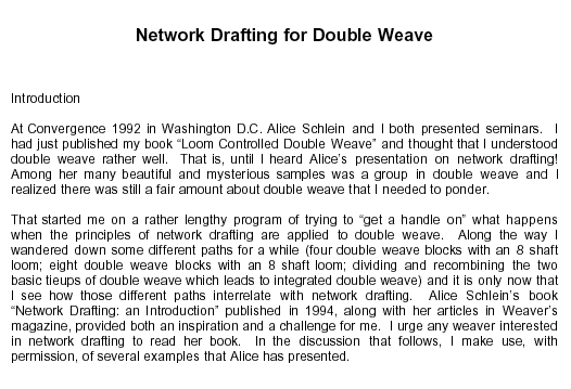 O'Connor, Paul R. Network Drafting for Double Weave, 86 pages. Posted April 27, 1999. FIRST PAGE. File size 1.0 MB PDF