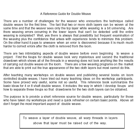 O'Connor, Paul R. Double Weave Workshop Notes: Double Weave with a Four-Shaft Loom, 17 pages. Posted February 4, 2000. FIRST PAGE. File size 156 KB PDF
