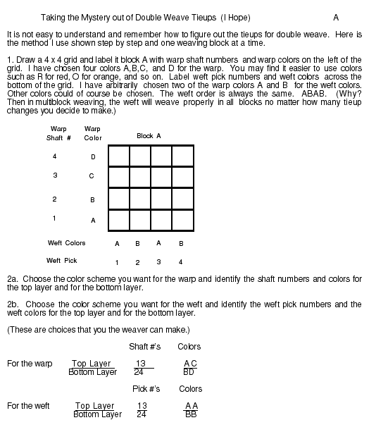 O'Connor, Paul R. Double Weave Workshop Notes: Taking the Mystery Out of Double Weave Tie-Ups, 8 pages. Posted February 4, 2000. FIRST PAGE. File size 31 KB PDF