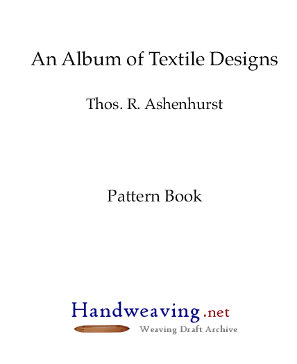 Griswold, Ralph E. An Album of Textile Designs by Thos. R. Ashenhurst, 92 pages. Note: Pattern book. Last revised August 24, 2004. WIFs of the patterns in this document are available at handweaving.net. Posted August 24, 2004. FIRST PAGE. File size 1.7 MB PDF