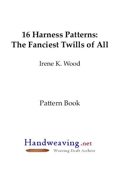 Griswold, Ralph E. 16-Harness Patterns: The Fanciest Twills of All, 12 pages. Note: Pattern book. Updated November 5, 2004. WIFs of the patterns in this document are available at handweaving.net. Posted July 15, 2005. FIRST PAGE. File size 908 KB PDF
