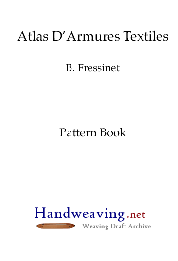 Griswold, Ralph E. Atlas D'Armures Textiles by B. Fressinet, 92 pages. Note: Pattern book. WIFs of the patterns in this document are available at handweaving.net. Posted November 20, 2004. FIRST PAGE. File size 1.6 MB PDF