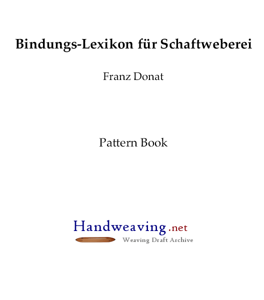 Griswold, Ralph E. Bindungs-Lexikon für Schaftweberei by Franz Donat, 199 pages. Note: Pattern book. WIFs of the patterns in this document are available at handweaving.net. Posted February 15, 2005. FIRST PAGE. File size 1.7 MB PDF