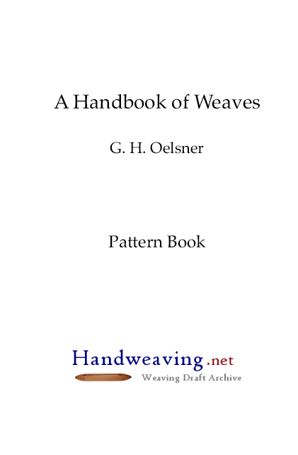 Griswold, Ralph E. A Handbook of Weaves by G. H. Oelsner, 92 pages. Note: Pattern book. WIFs of the patterns in this document are available at handweaving.net. Posted November 20, 2004. FIRST PAGE. File size 1.7 MB PDF