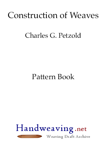 Griswold, Ralph E. Construction of Weaves, Charles G. Petzold, 31 pages. Note: Pattern book. Last modified August 22, 2004. WIFs of the patterns in this document are available at handweaving.net. Posted August 22, 2004. FIRST PAGE. File size 1 MB PDF