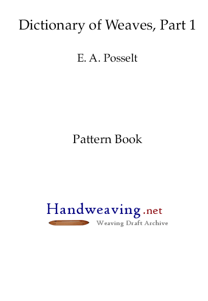 Griswold, Ralph E. Dictionary of Weaves, Part 1 by E. A. Posselt, 26 pages. Note: Pattern book. Last revised August 23, 2004. WIFs of the patterns in this document are available at handweaving.net. Posted August 24, 2004. FIRST PAGE. File size 1 MB PDF