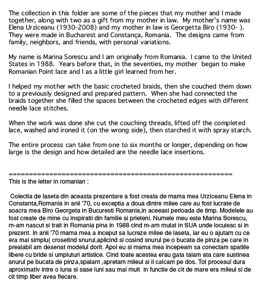 Sorescu, Marina. Români Punct de Dantela (Romanian Point Lace), 13 pages. Note: private collection of Marina Sorescu by permission. Posted June 30, 2009. FIRST PAGE. File size 1.2 MB PDF
