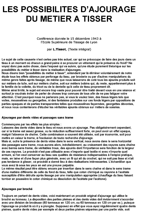 Tissot, L. Les Possibilites D'Ajourage de Metier a Tisser, 11 pages. Note: Contributed by Philippe Demoule. Posted December 3, 2003. FIRST PAGE. File size 900 KB PDF