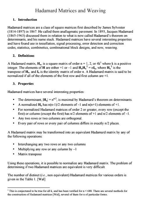 Wentink, Allan. Hadamard Matrices and Weaving, 4 pages. Posted December 21, 2004. FIRST PAGE. File size 104 KB PDF