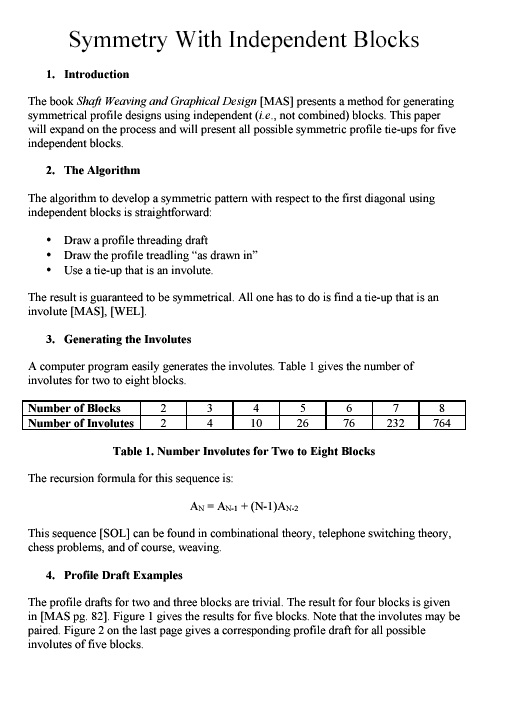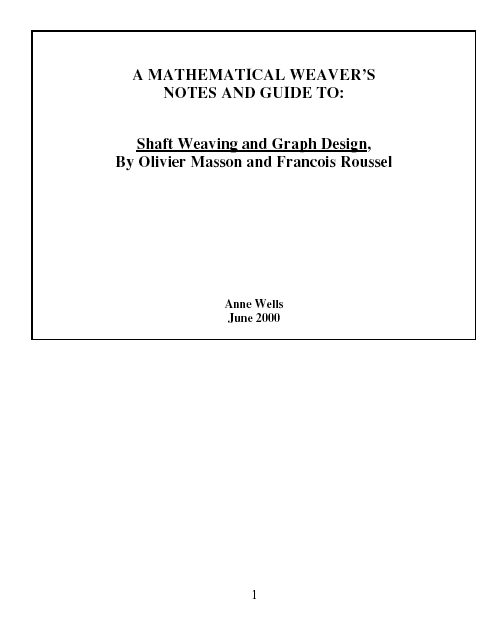 Wells, Anne. A Mathematical Weaver's Notes and Guide to: Shaft Weaving and Graph Design by Olivier Masson and Francois Roussel, 60 pages. Posted June 2, 2000. FIRST PAGE. File size 289 KB PDF