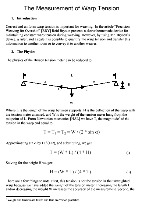 Wentink, Allan. The Measurement of Warp Tension, 3 pages. Posted January 4, 2005. FIRST PAGE. File size 88 KB PDF