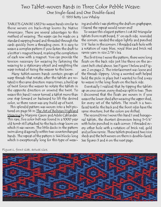 Whaley, Betty Lou. Two Tablet-Woven Bands in Three Color Pebble Weave, 2 pages. Posted June 30, 1999. FIRST PAGE. File size 280 KB PDF