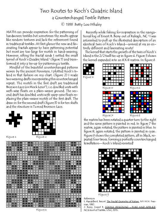 Whaley, Betty Lou. Two Routes to Koch's Quadric Island: A Counterchanged Textile Pattern, 1 page. Posted May 26, 1999. FIRST PAGE. File size 158 KB PDF
