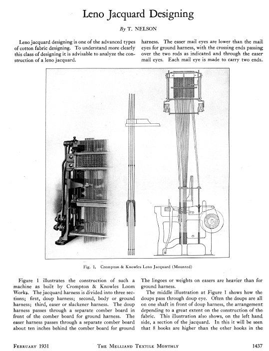 Leno Jacquard Designing, Nelson, T. The Melliand, Vol. 2, No. 11 (February 1931), 4 pages. Posted December 11, 2002. SAMPLE PAGE. File size 1.2 MB PDF